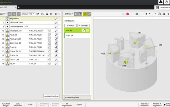 El software para PC vTNC7 para crear programas NC para los controles numéricos HEIDENHAIN lleva la asistencia al usuario orientada a las tareas a otro nivel gracias a un hchatbot con IA. Además, gracias a la nueva función Feature Based Programming, permite generar automáticamente programas en texto de lenguaje conversacional Klartext de Heidenhain a partir de datos CAD de modelos 3D. El nuevo convertidor de lenguaje conversacional Klartext de HEIDENHAIN traduce automáticamente los programas NC generados para que incluso los controles numéricos TNC7 anteriores, sin las opciones específicas, puedan ejecutarlos sin problemas.